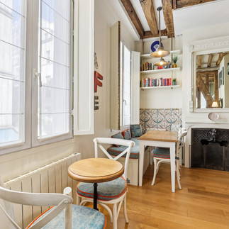 This co-ownership apartment features antique wooden beams typical of homes in the Marais; it has all the charm you would expect of a Paris home and features parquet floors, custom millwork, and air-conditioning. Professionally designed and decorated by the original developers' team, the apartment features a lively color palette and beautiful furnishings. The layout is optimal and features a fully equipped kitchen, dining alcove, decorative fireplace, living room with custom Italian leather sleeper sofa, a full bathroom with walk-in shower, and a bedroom with a queen-size bed and an en-suite WC. Developed in 2019, this 13-member co-ownership has a very successful and congenial group of like-minded owners. The home sleeps 4, and no pets or smoking are allowed.